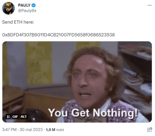 Il lui a suffi d'un seul tweet, du tweet à un million de dollars pour récolter énormément d'ETH dans le portefeuille sous le nom de yougetnothing.eth !