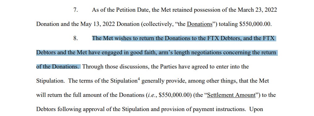 "Le Met souhaite restituer les dons aux débiteurs FTX, et les débiteurs FTX et le Met ont engagé des négociations de bonne foi et sans lien de dépendance concernant le retour des dons."